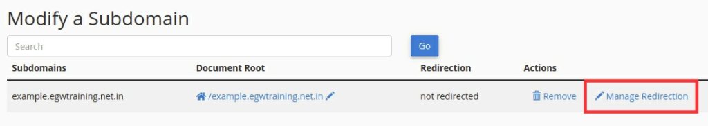 Step 1: Navigate to the Manage Redirection link for the subdomain you wish to manage.