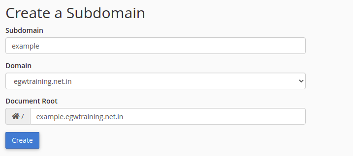 - If you enter the subdomain in the Directory text box and the home directory in the cPanel account is /home/eglueweb, the subdomain will be created under /home/eglueweb/subdomain.eglueweb.com/
